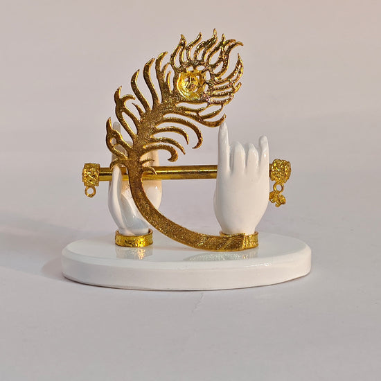 The mor pankh and murali rest elegantly between two upward-facing white palms, symbolizing divine offering, protection, and reverence.